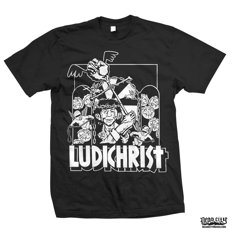 The front features the original old school art from the 1980's by Ludichrist guitarist Glen Cummings. Exact replica of one of the earliest designs that the band had on a shirt in the mid 80's..