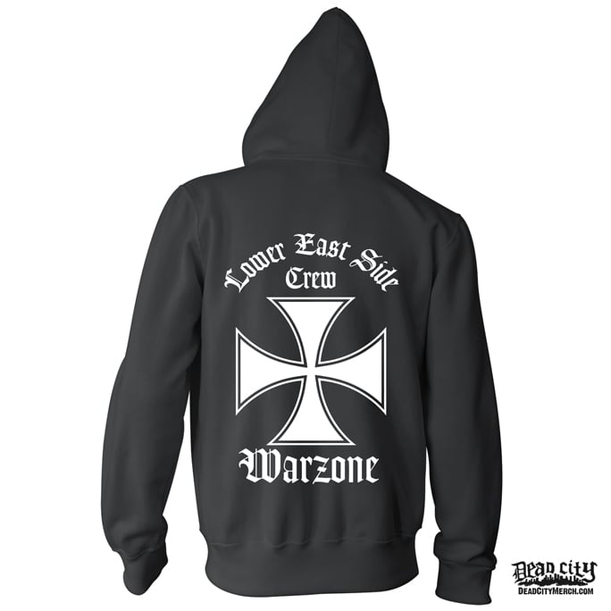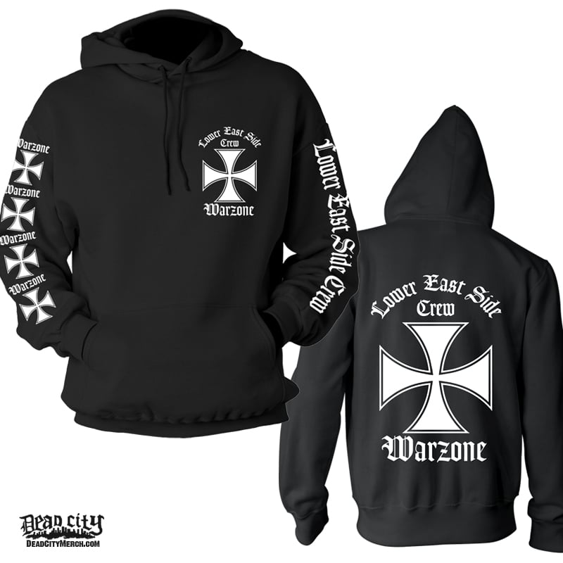The front features the classic Warzone design as a pocket print. The back features the full size design. One sleeve has multiple Logo's and Iron Crosses, and the other sleeve features the words "Lower East Side Crew".