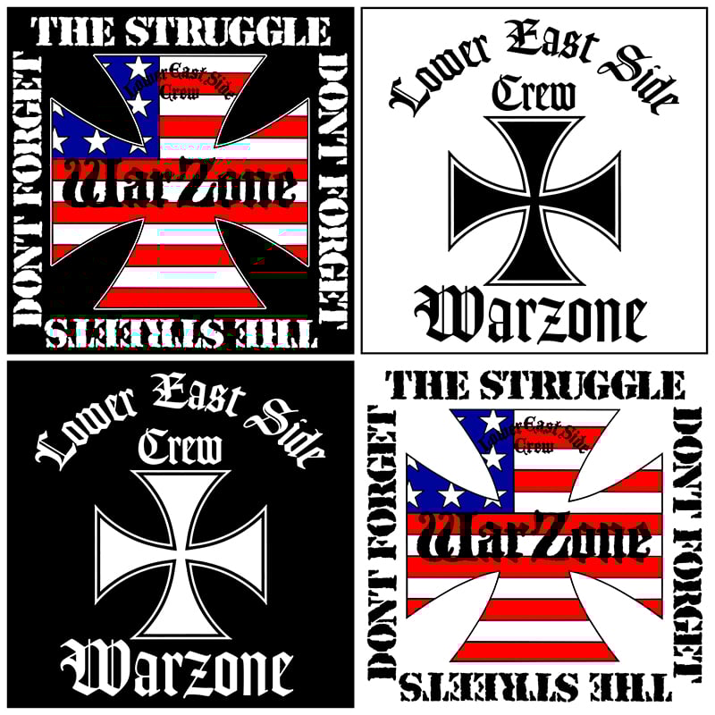 WARZONE Sticker Pack. Set of 4 Vinyl stickers. Featuring 2 Don't Forget The Struggle stickers. 2 Lower East Side Crew sticlers. Each sticker dimension is approx 4 inches x 4 inches.